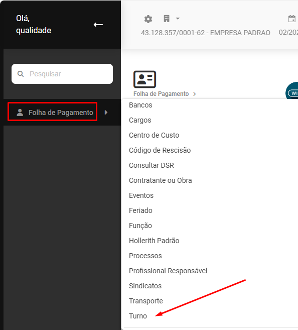 Como corrigir: Acesse o menu Folha de Pagamento>Cadastros>Turno