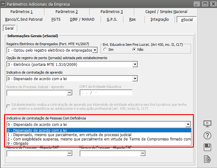 Como Corrigir: Para realizar o preenchimento acesse: Manutenção > Empresas > Parâmetros Adicionais da empresa, aba “e-Social” o indicativo de pessoa com deficiência.