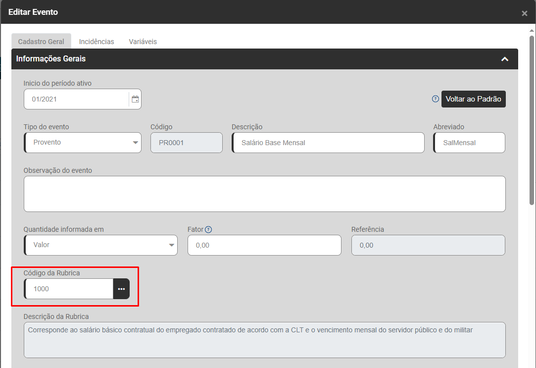 Faça a Conferência do campo Código da Rubrica de todos os Eventos que constam do hollerith