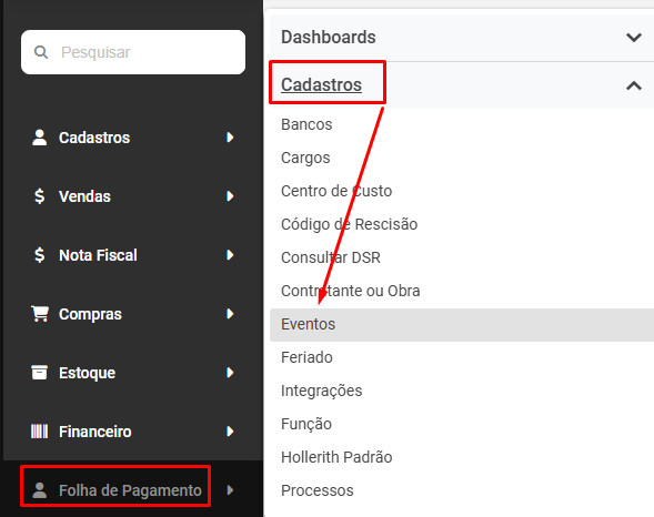 Em seguida acesse Folha de Pagamento>Cadastros>Eventos