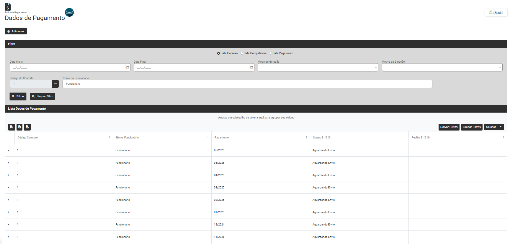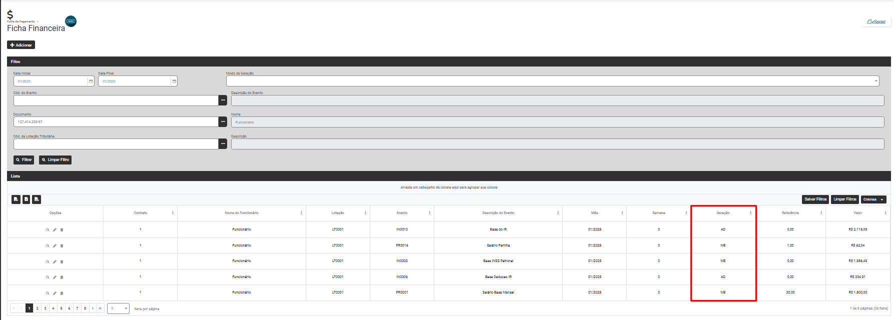 Será apresentada a tela com as informações da Ficha Financeira, filtre pelo Código do Trabalhador que apresentou a inconsistência