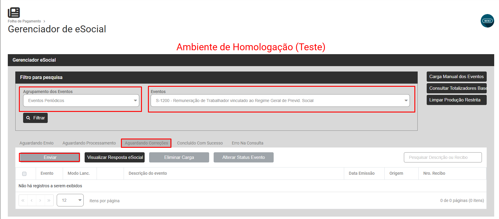 Filtre por Eventos Periódicos - S-1200, Aguardando Correção, selecione o evento que apresentou a inconsistência e faça novamente o envio do mesmo para o Portal do eSocial