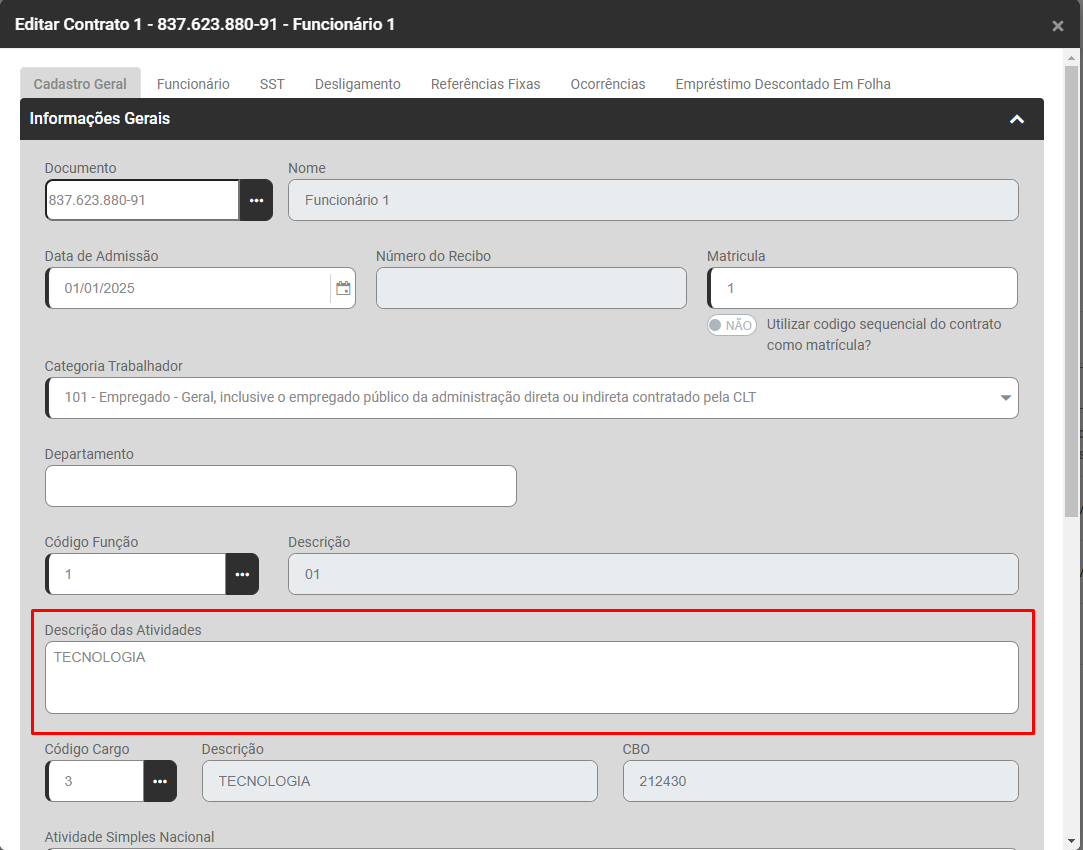 Ação Sugerida: Conferência da Descrição das Atividades no cadastro do funcionário