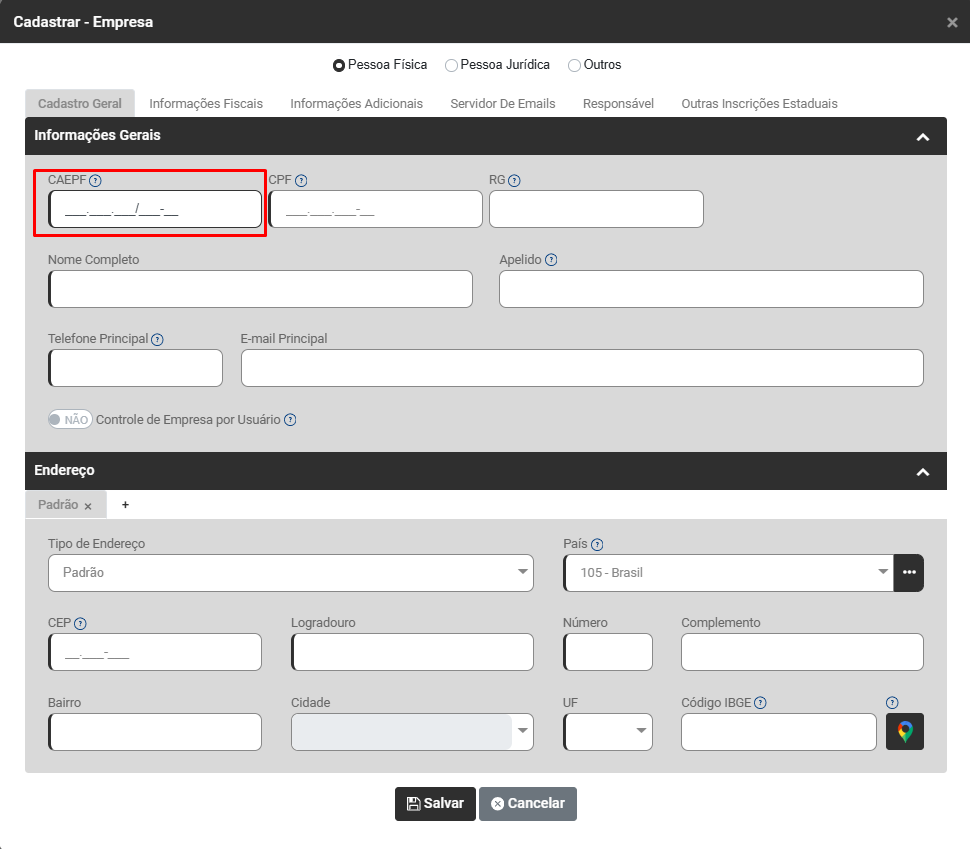 Edite a Empresa que apresentou a inconsistência e na aba Cadastro Geral>Informações Gerais, verifique se o campo CAEPF foi preenchido corretamente