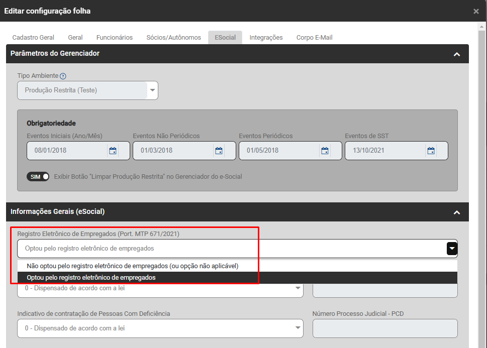 Verifique o campo "Registro Eletrônico de Empregados (Portaria MTP 671/2021), faça corretamente o preenchimento do campo e salve a informação.