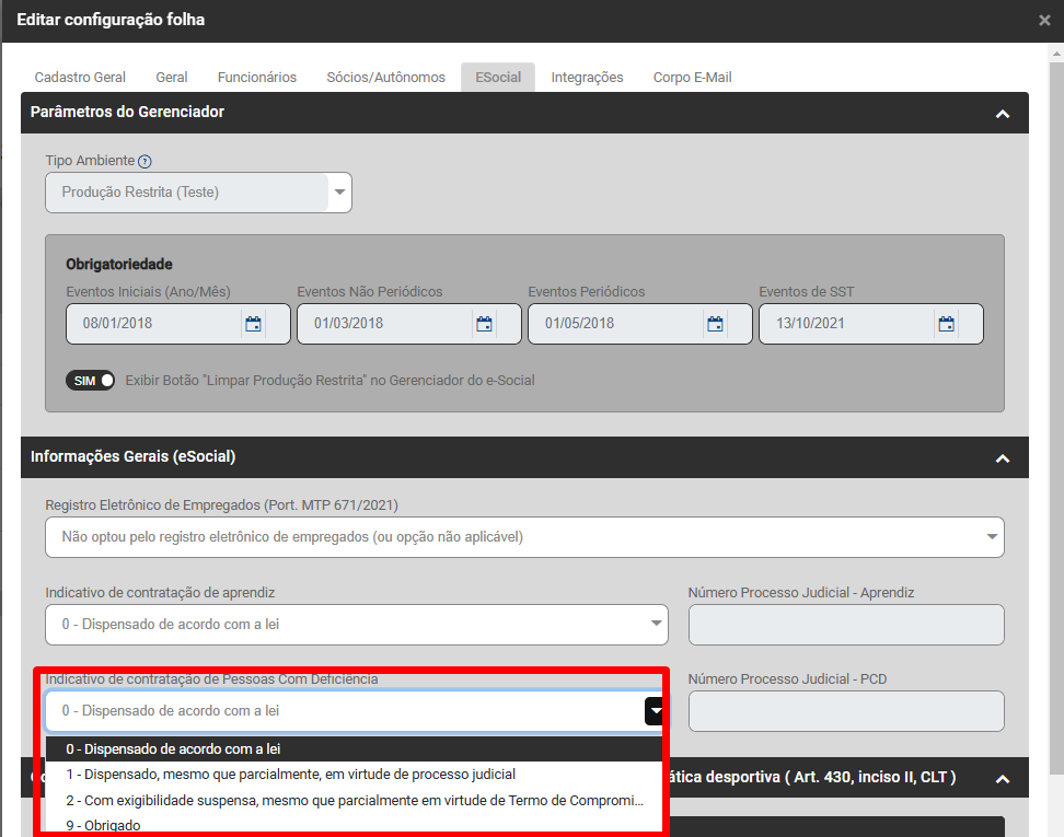 Solução: O campo de Contratação de PCD (Pessoa com Deficiência) está em branco. Acesse Configurações