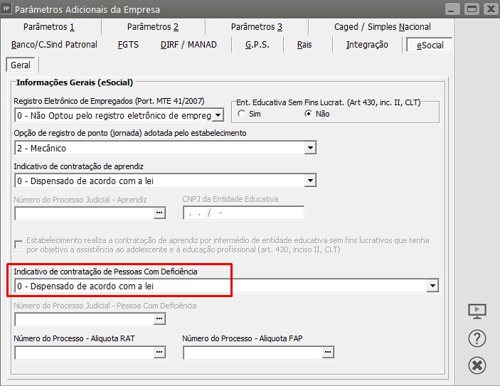 > Empresas > Parâmetros Adicionais da empresa > aba “e-Social” o indicativo de pessoa com deficiência