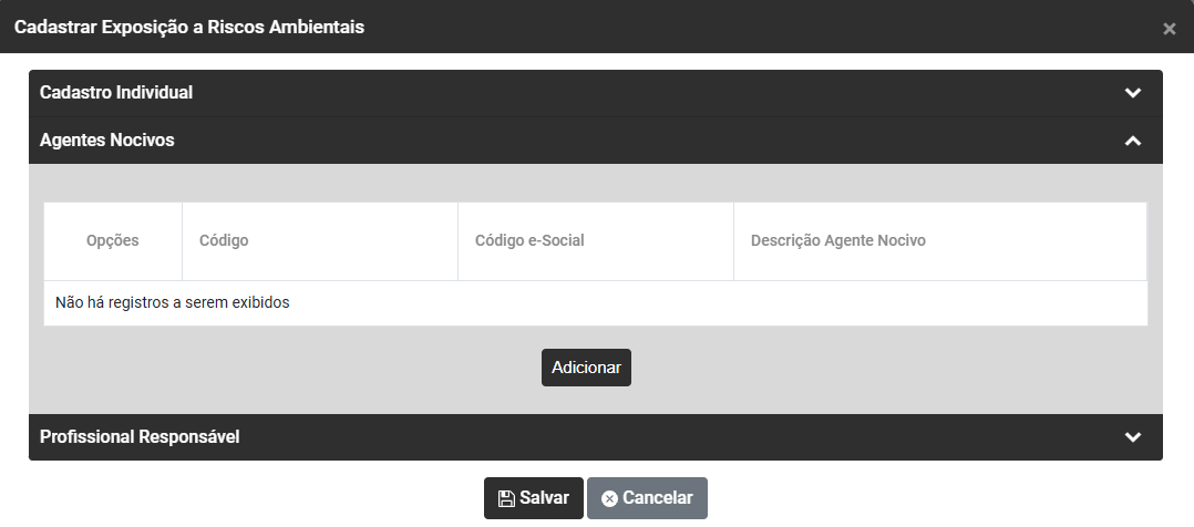 Solução: Acesse o menu Folha de Pagamento>Saúde e Segurança do Trabalho>Condições Ambientais do Trabalho