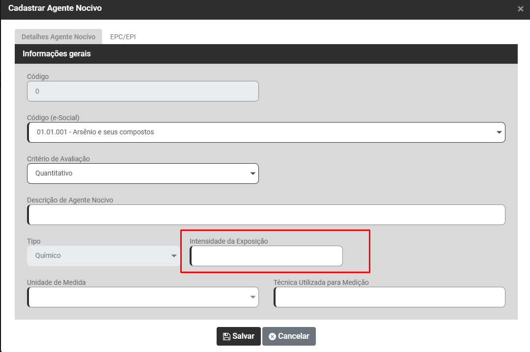 Ação Sugerida: Conferência da informação inserida do campo Intensidade da Exposição do Agente Nocivo.