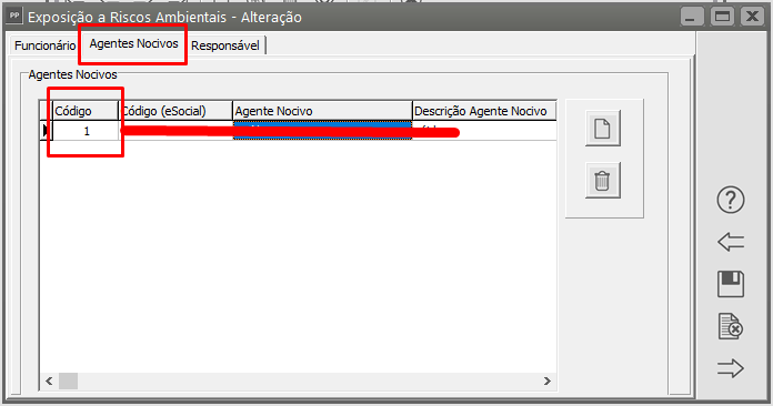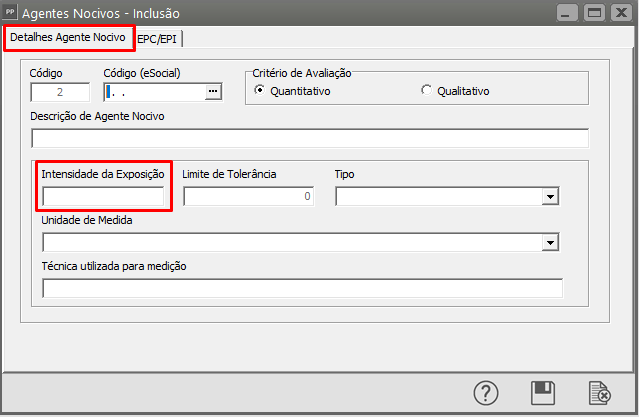 Agora acesse: Manutenção > Tabelas > Agentes Nocivos > Manutenção > Filtre pelo código do agente nocivo que foi verificado no passo a cima > no campo "Intensidade da Exposição", preencher apenas com números e vírgula > salvar.
