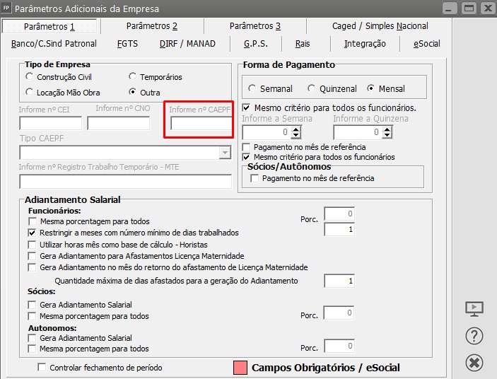 Solução: Acesse Manutenção>Empresas>Parâmetros Adicionais da Empresa>aba Parâmetros 1 e