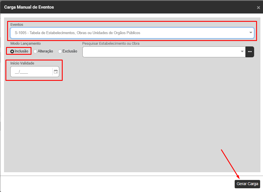Para criar a carga manual acesse o botão "Carga Manual dos Eventos"