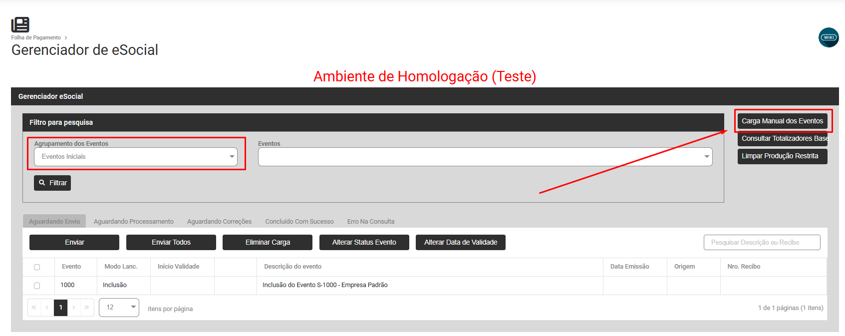 Em seguida acesse novamente a Aba Aguardando Envio, selecione o evento S1005 (carga gerada manualmente) e faça o envio para o Portal do eSocial através do menu Folha de Pagamento>Movimentação>Gerencia eSocial