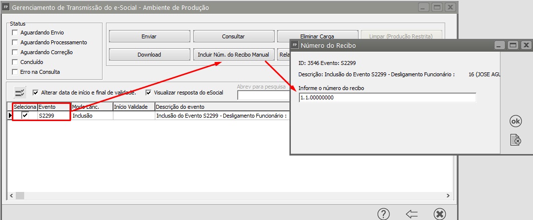 Solução: Acessar o Portal do eSocial, copiar o número do recibo do Desligamento, em seguida acessar o Sistema Folha de Pagamento > Gerenciamento de Transmissão do eSocial, pesquisar pelo Evento Não Periódico S2299 e clicar na seta avança, em seguida procurar pelo funcionário, selecioná-lo e clicar em Incluir Número do Recibo Manual, será aberta a tela para voce colar o número do recibo copiado do portal do eSocial.