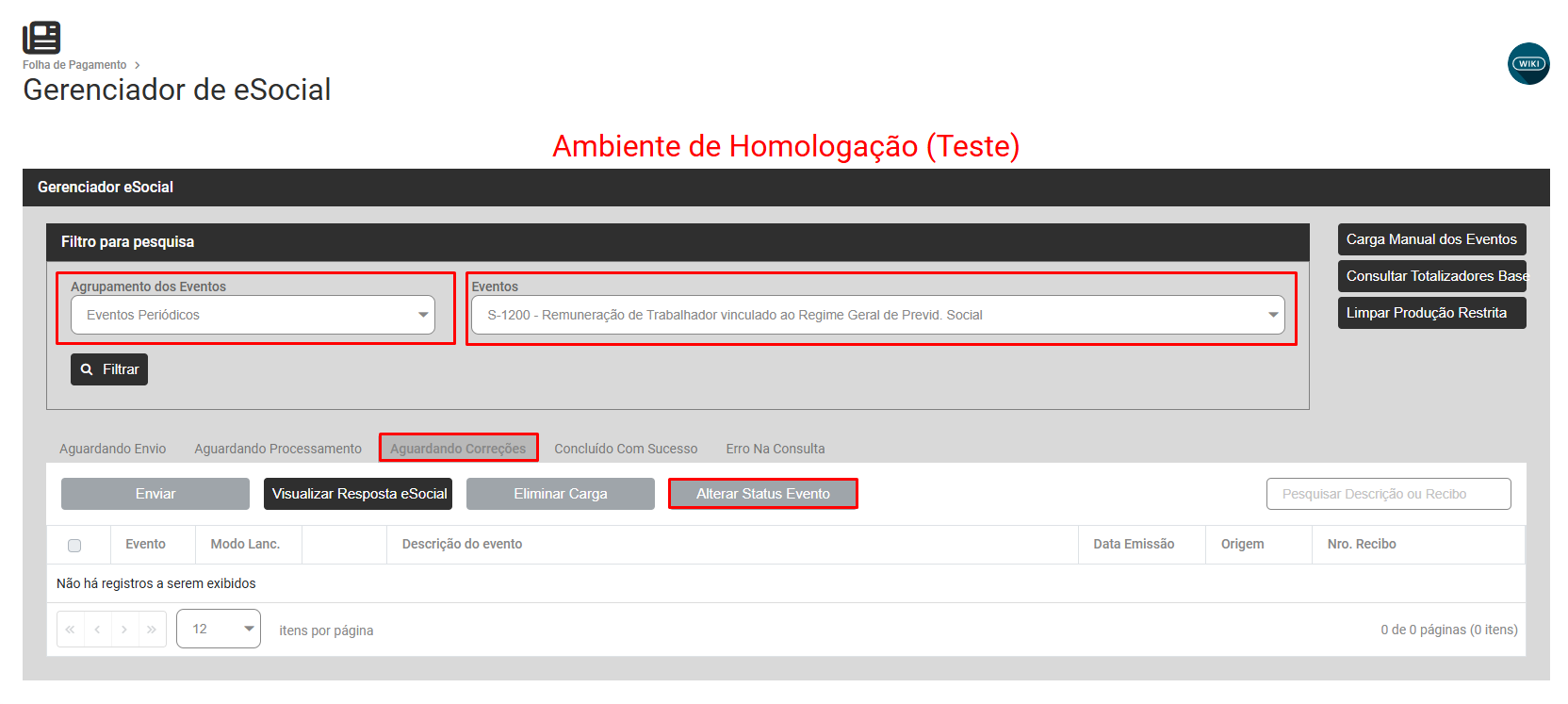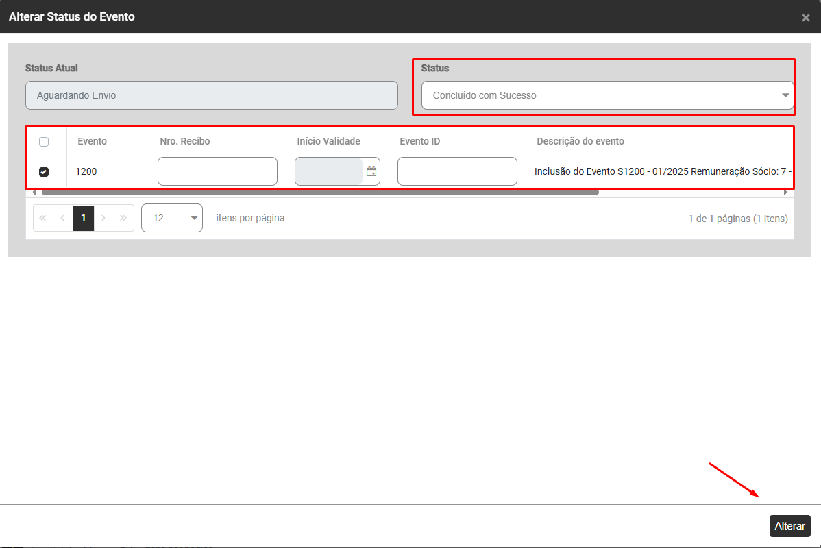 Filtrar por Eventos Periódicos - S1200 - Aguardando Correção e selecionar o trabalhador que teve o evento rejeitado pelo Portal do eSocial, em seguida clique no botão Alterar Status do Evento