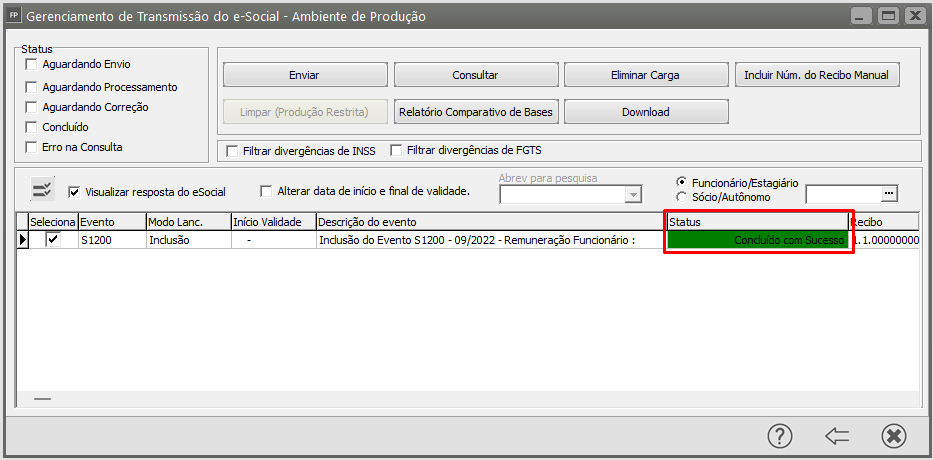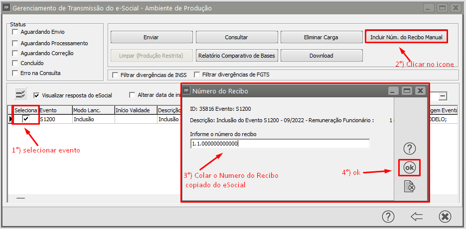 Solução: Acessar o Portal do eSocial, Folha de Pagamento > Mês / Ano em que ocorreu a Rejeição > menu Remuneração Devida > Ver Remuneração > copiar o número do recibo no fim da página e em seguida acessar o Sistema Folha de Pagamento > Gerenciamento de Transmissão do eSocial, pesquisar pelo Evento Periódico S1200 e clicar na seta avança, em seguida procurar pelo funcionário, selecioná-lo e clicar no ícone: Incluir Número do Recibo Manual, será aberta a tela para voce colar o número do recibo copiado do portal do eSocial e confirma-lo: