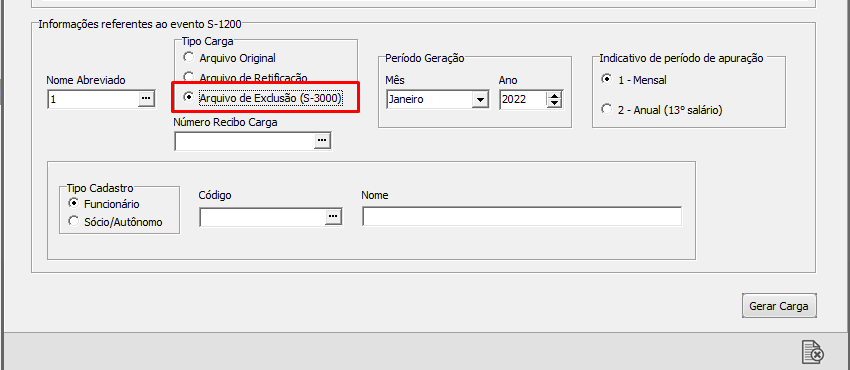 Defina de qual evento você deseja gerar a carga manual de EXCLUSÃO
