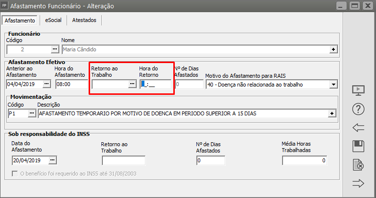 Como corrigir: Deverá ser inclusa a data de retorno de afastamento para que seja criada a carga do S2230. Para incluir a data de afastamento acesse: Movimentação > Rotinas Mensais > Afastamentos > Funcionários > Manutenção, identifique o afastamento e inclua a data de retorno: