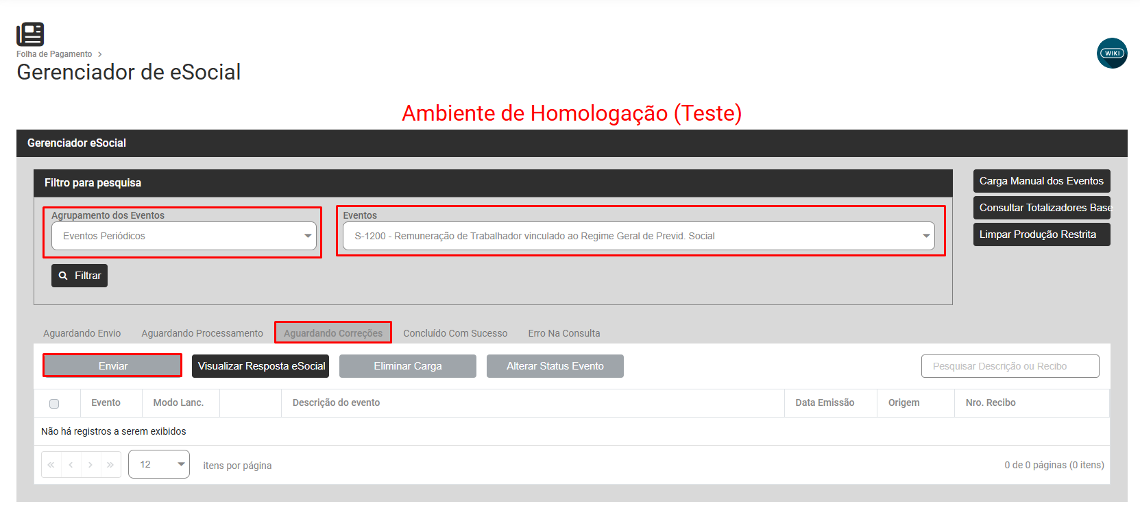 Filtre por Eventos Periódicos - S1200, Aguardando Correção, selecione o evento que apresentou a rejeição e faça novamente o envio para o Portal do eSocial