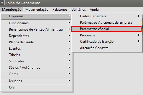 Correção:  Acesse o menu Manutenção > Empresas > Parâmetros eSocial.