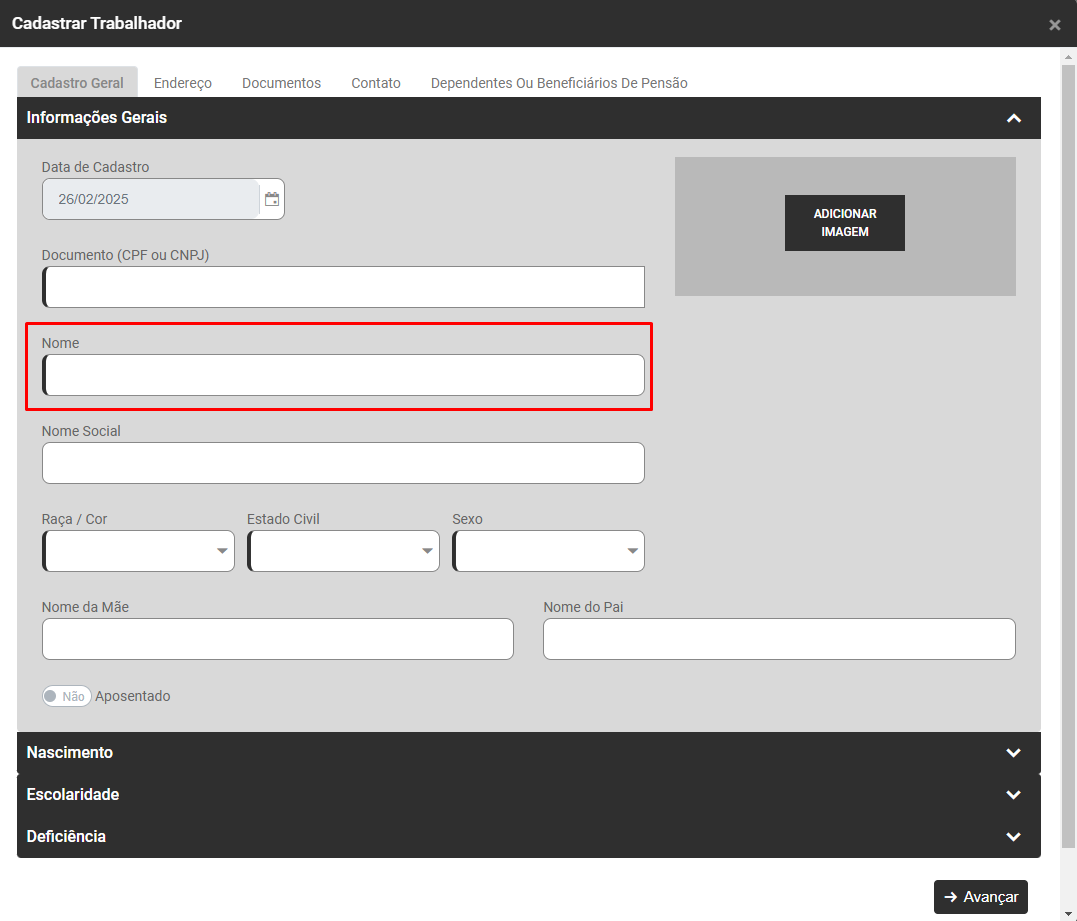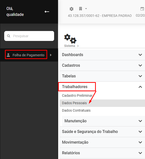 - Acesse o cadastro do Funcionário em Folha de Pagamento>Trabalhadores>Dados Pessoais