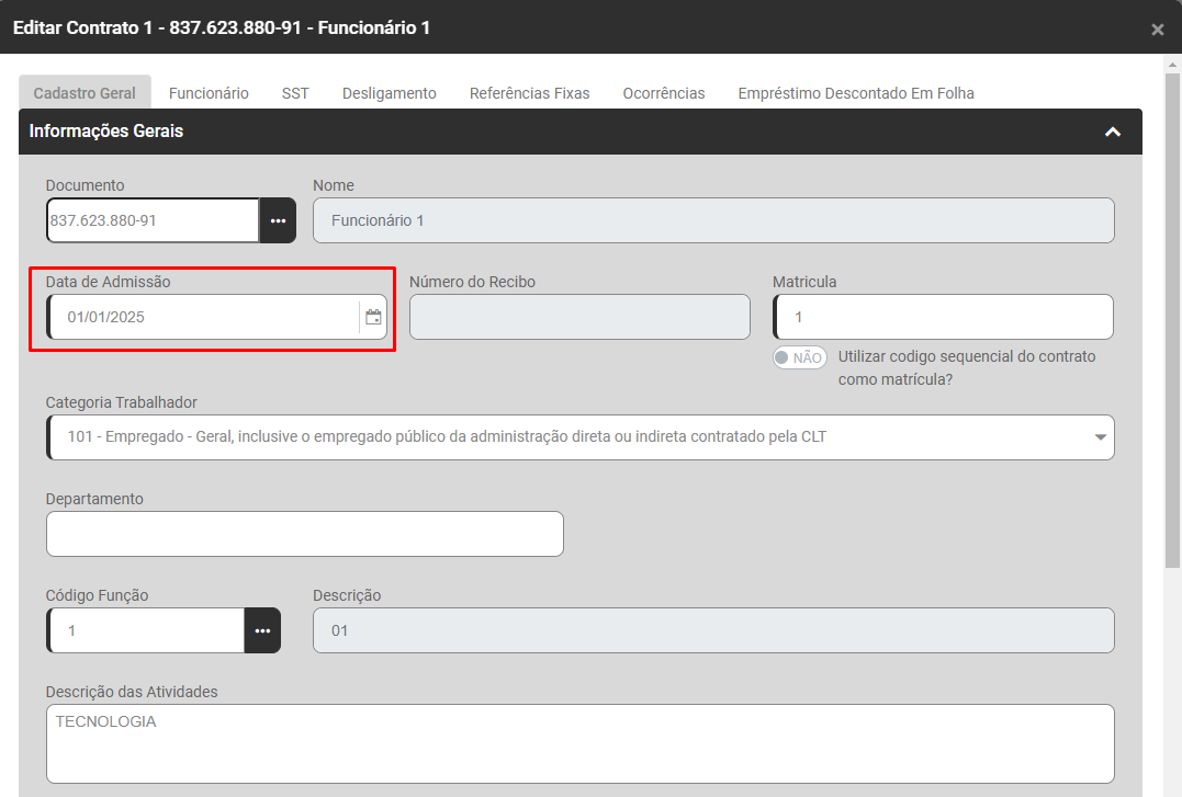 Edite os Dados Contratuais do Trabalhador que apresentou a inconsistência e acesse a aba Cadastro Geral>Informações Gerais - Campo Data de Admissão e faça a conferência da informação cadastrada