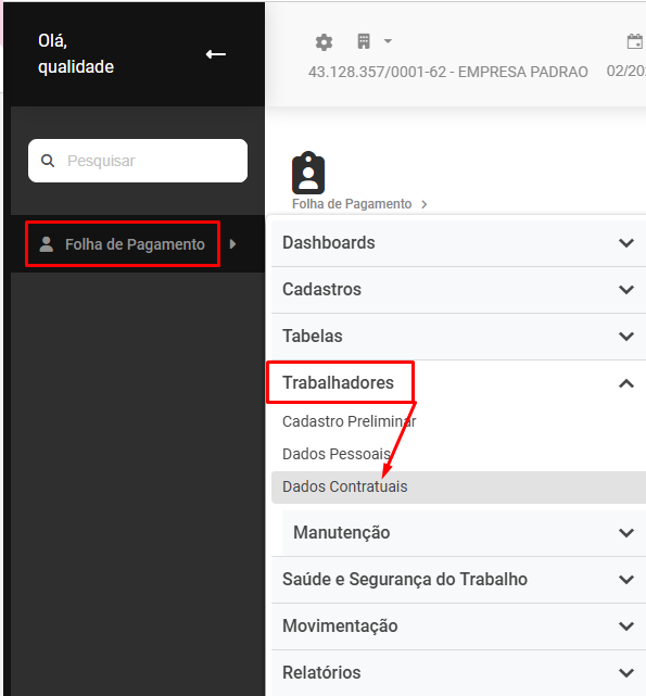 Correção: Acesse o menu Folha de Pagamento>Trabalhadores>Dados Contratuais