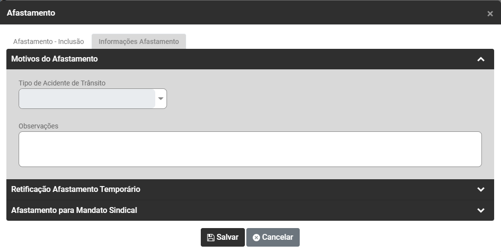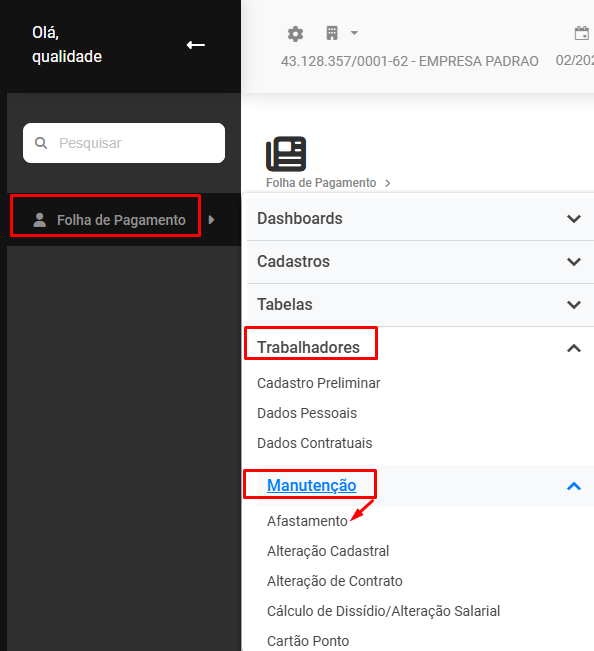 Correção: Acesse o menu Folha de Pagamento>Trabalhadores>Manutenção>Afastamentos