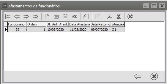 Correção: Acesse o menu Movimentação > Rotinas Mensais > Afastamentos, pesquise pelo código do funcionário e clique na seta avança, em seguida confira as informações do afastamento e do retorno do afastamento