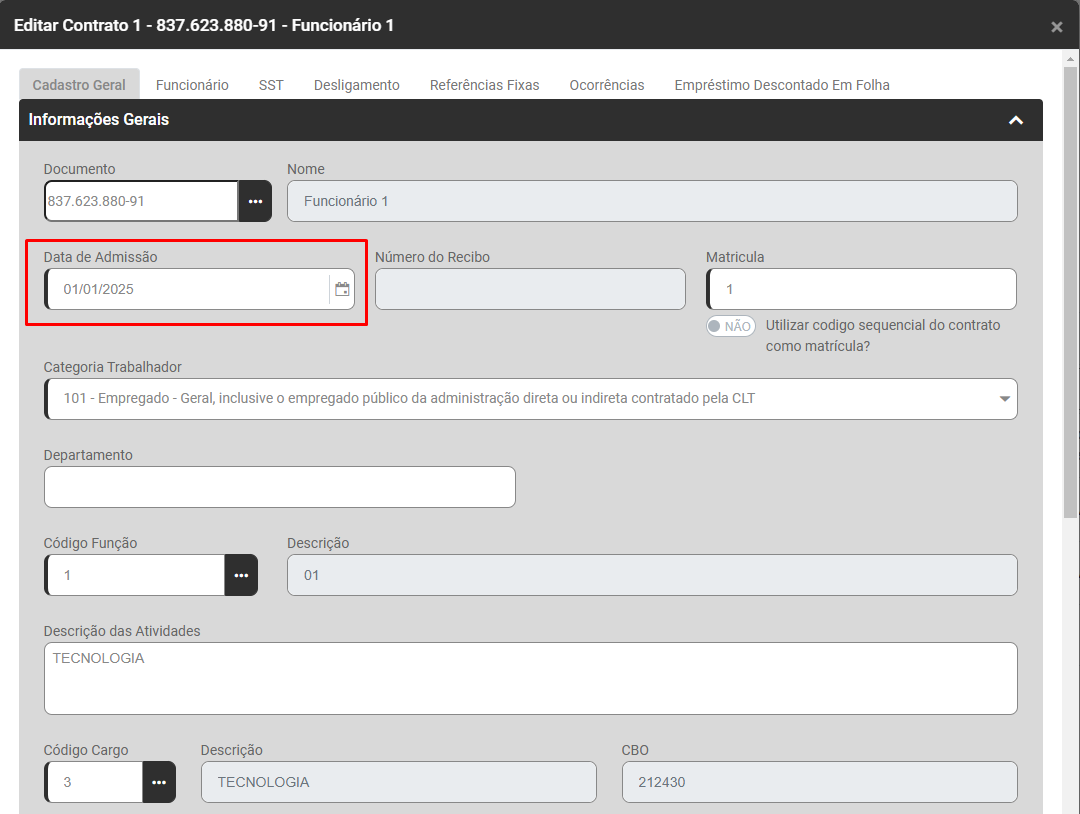 Edite o cadastro do Funcionário que apresentou a inconsistência e acesse a aba Cadastro Geral>Informações Gerais