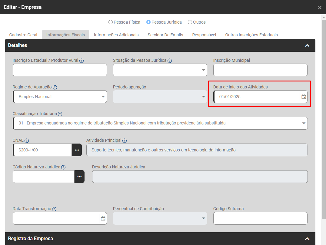 Acesse a aba Informações Fiscais e faça a conferência do campo Data de Início das Atividades