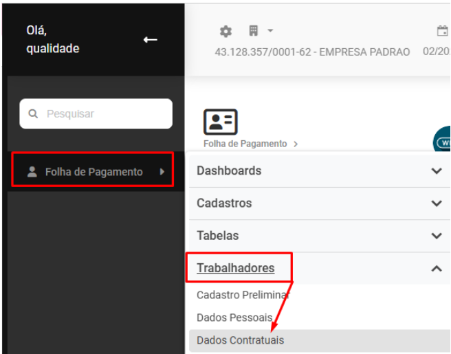 Acesse o menu Folha de Pagamento>Trabalhadores>Dados Contratuais