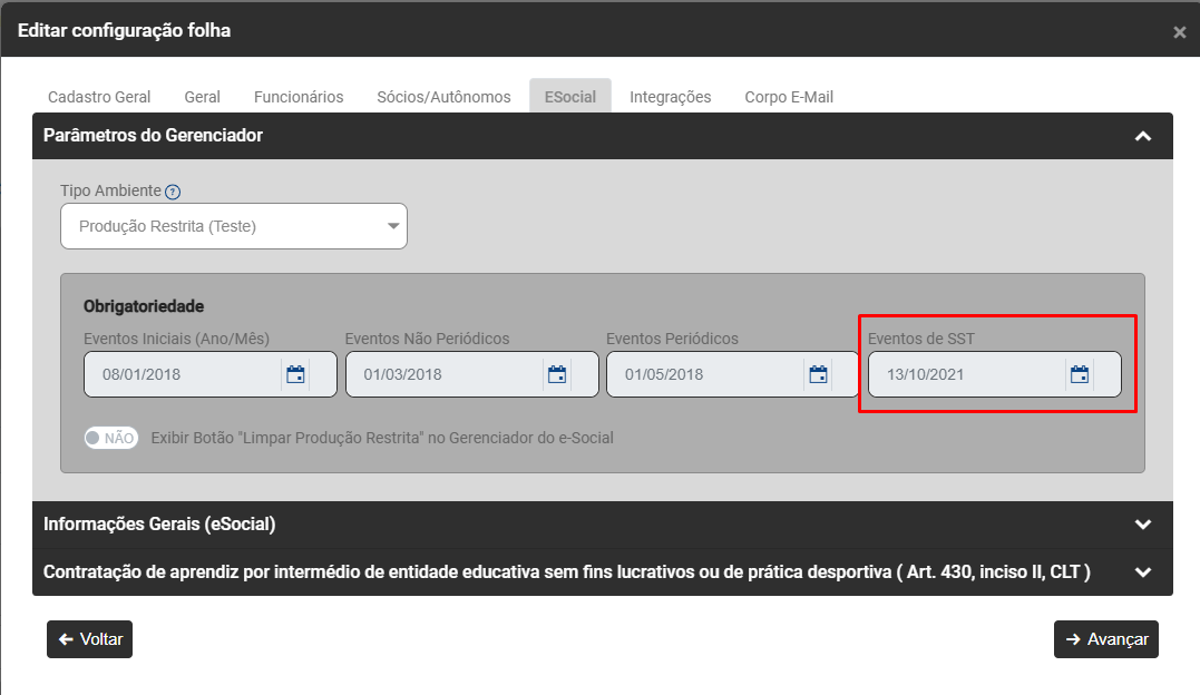 Esses dados não podem ser anterior aos dados da obrigatoriedade dos Eventos de SST