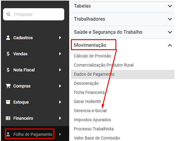 Acesse o menu Folha de Pagamento>Movimentação>Gerencia eSocial