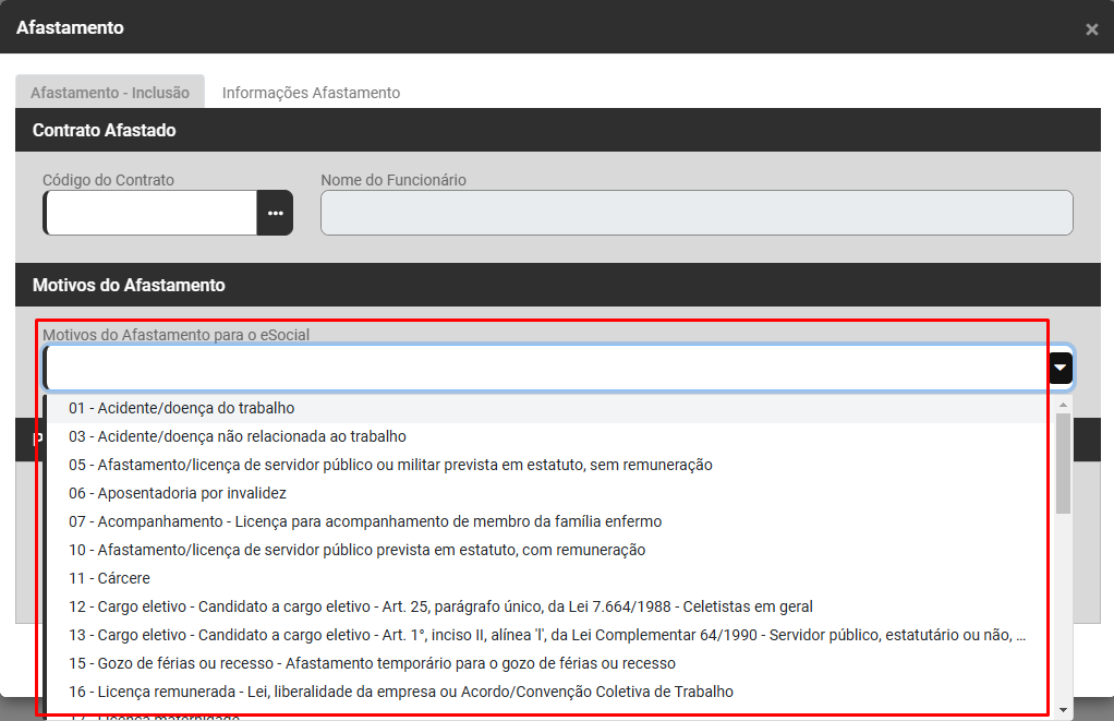 Ação Sugerida: O valor informado no campo deverá existir na Tabela 18 (Motivo do Afastamento).