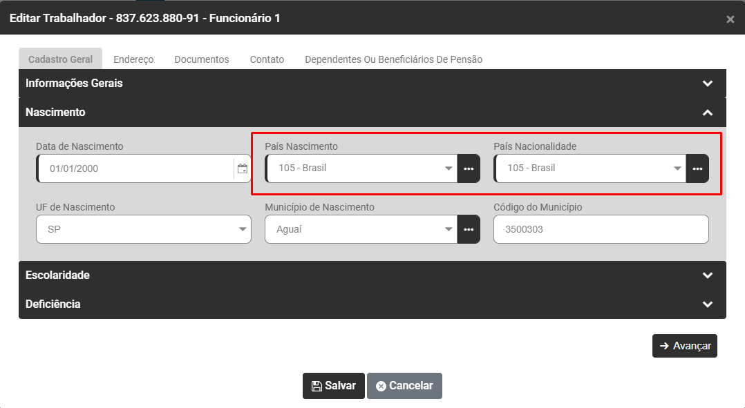 Edite os Dados Pessoais do Trabalhador que apresentou a inconsistência na aba Cadastro Geral - Campo Nascimento