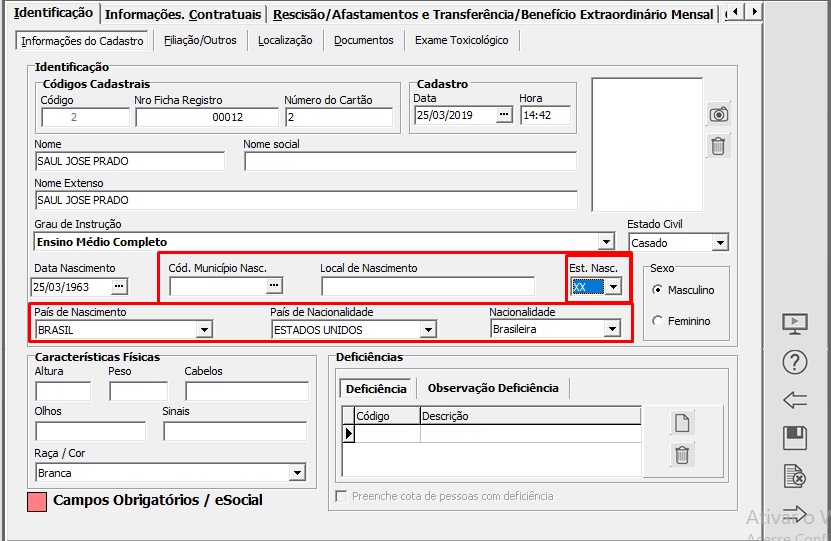 Acesse a aba Identificação > Filiação/Outros e verifique senovamente o campo Estrangeiro está preenchido corretamente