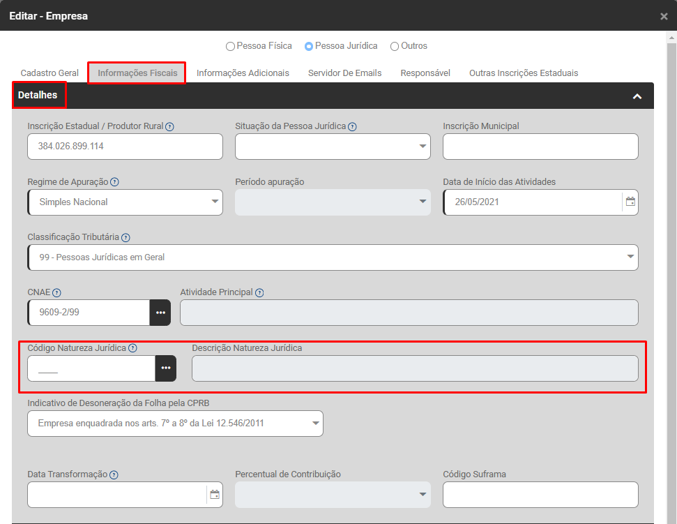 Edite o Cadastro da Empresa e acesse a aba Informações Fiscais>Detalhes - campo Código da Natureza Jurídica (Identificação da constituição jurídico - institucional das entidades públicas e privadas nos cadastros da administração pública do País.), confira a Natureza Jurídica informada, altere caso esteja errado.