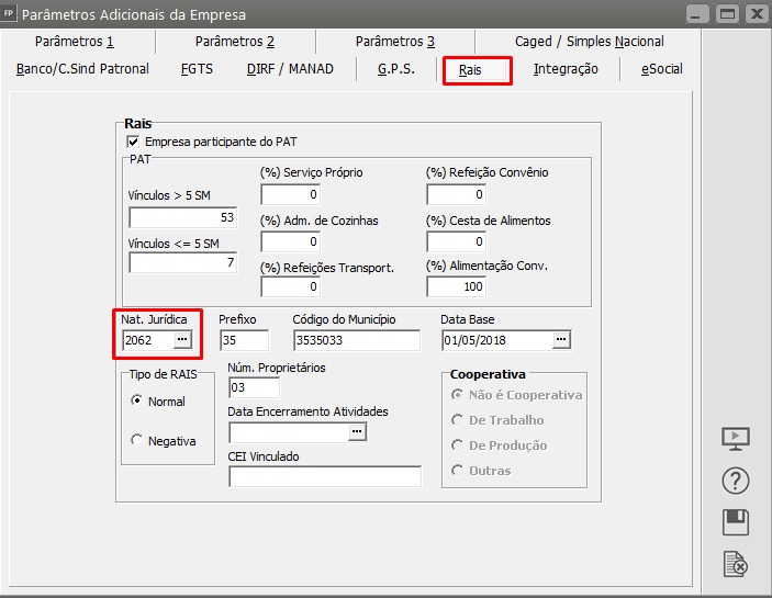 Correção: Acessar o menu Manutenção > Empresas > Parâmetros Adicionais da Empresa > Aba RAIS, conferir a Natureza Jurídica informada, alterar caso esteja errada.