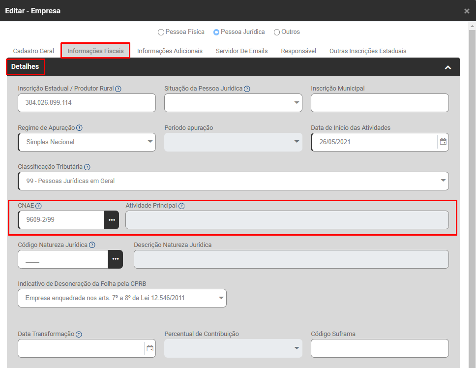 Em seguida acesse a aba Informações Fiscais>Detalhes - Campo CNAE