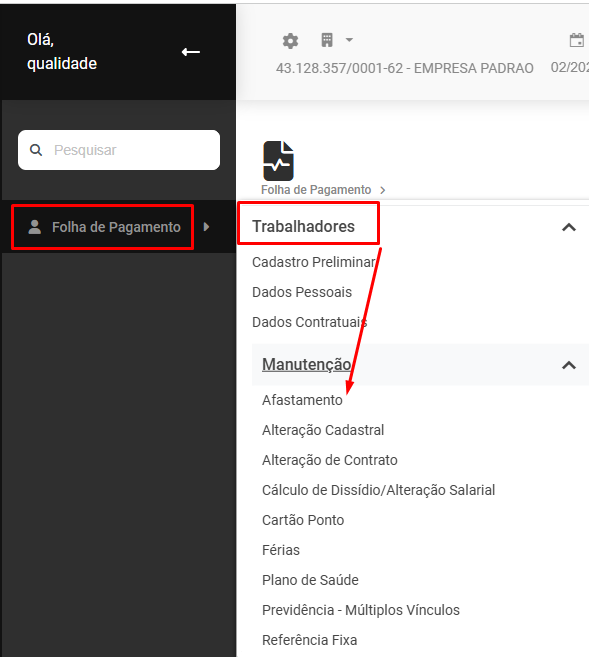 Correção: Acesse o menu Menu Folha de Pagamento>Trabalhadores>Afastamento