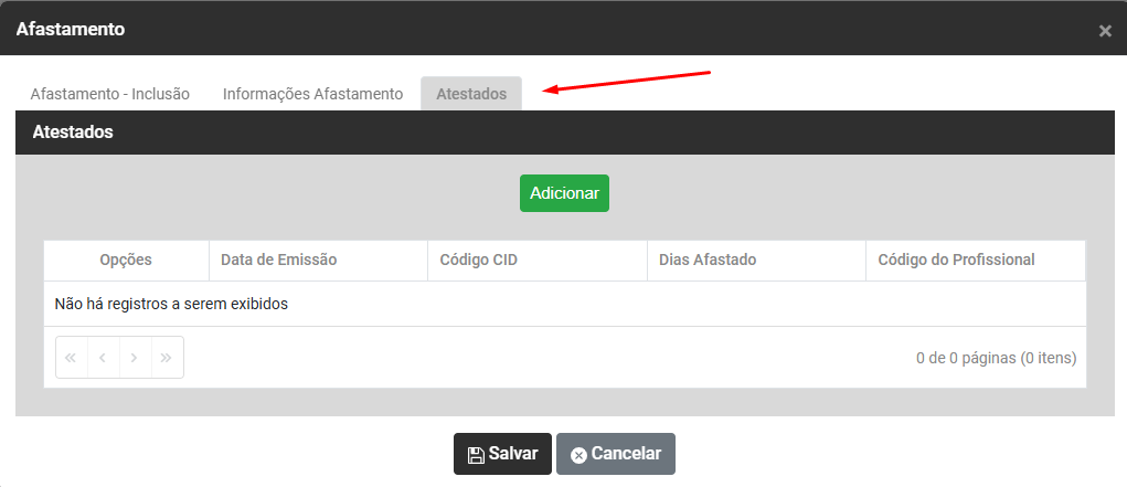 Edite o cadastro do afastamento e confira as informações da aba Atestados]