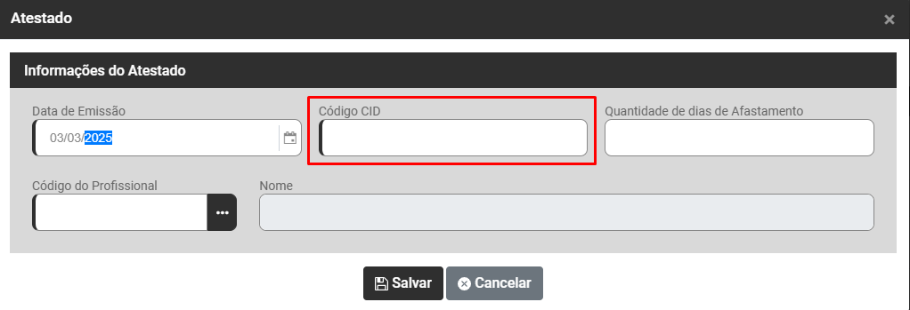 O Código deve pertencer a tabela CID (Classificação Internacional de Doenças)