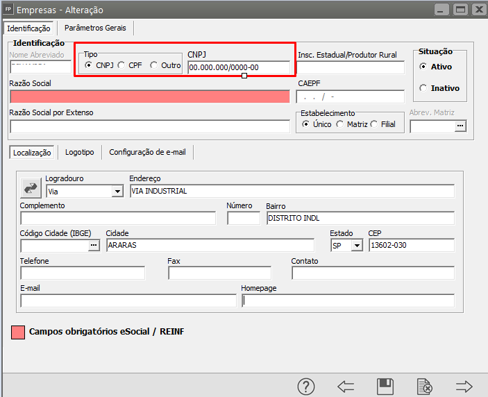 Em seguida edite o cadastro da empresa e confira o campo Tipo (CNPJ, CPF, Outros) e o número informado