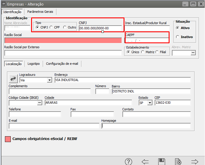 Em seguida edite o cadastro da empresa e confira o campo Tipo (CNPJ, CPF, Outros) e o número informado e se a empresa possuir CAEPF faça a conferência do mesmo.