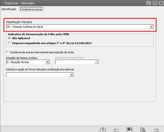 Correção: Acesse o menu Manutenção > Empresas > Dados Cadastrais > Manutenção e entre na aba Parâmetros Gerais, confira a informação do campo Classificação Tributária.