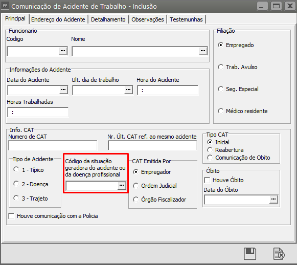 Correção: Acesse o Sistema PPP no menu Movimentação > CAT Geração > Manutenção, edite a CAT (Comunicação de Acidente de Trabalho emitida) e confira na aba Principal o campo Código da situação geradora do acidente ou da doença profissional.