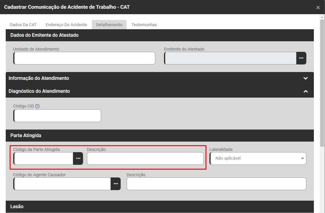 Edite a CAT do Trabalhador que apresentou a inconsistência e confira na aba Detalhamento o Campo Código da Parte Atingida