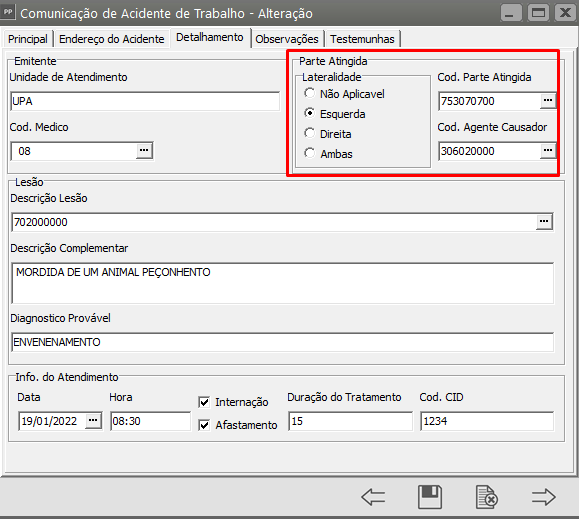 Em seguida edite o CAT e acesse a aba Detalhamento, confira as informações cadastradas no Campo Parte Atingida.