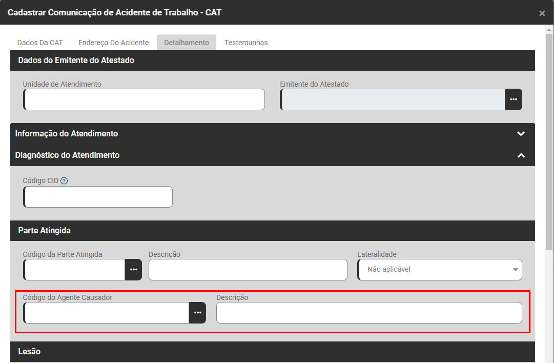 Edite a CAT do Trabalhador que apresentou a inconsistência e confira na aba Detalhamento - Campo Diagnóstico do Atendimento qual foi o Código do Agente Causador